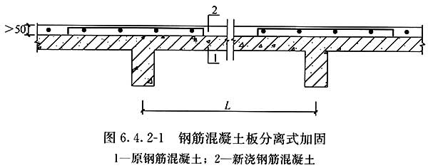 ????1??當(dāng)在鋼筋混凝土板上部采取加大截面進(jìn)行分離式補(bǔ)強(qiáng)時(shí)(圖6.4.2-1),其正截面承載力應(yīng)按新舊混凝土板疊加方法計(jì)算,其分配系數(shù)應(yīng)按本標(biāo)準(zhǔn)式(6.1.4-1)和式(6.1.4-2)驗(yàn)算;