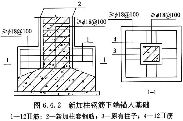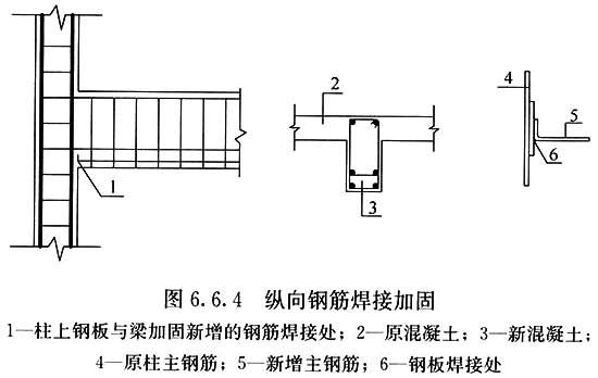 ????3??加固新增的縱向鋼筋與柱縱向鋼筋應(yīng)焊接牢固,并應(yīng)直接焊在柱的縱向鋼筋上,加固新增的縱向鋼筋應(yīng)伸入支座兩端,并不應(yīng)少于120mm(圖6.6.4)。